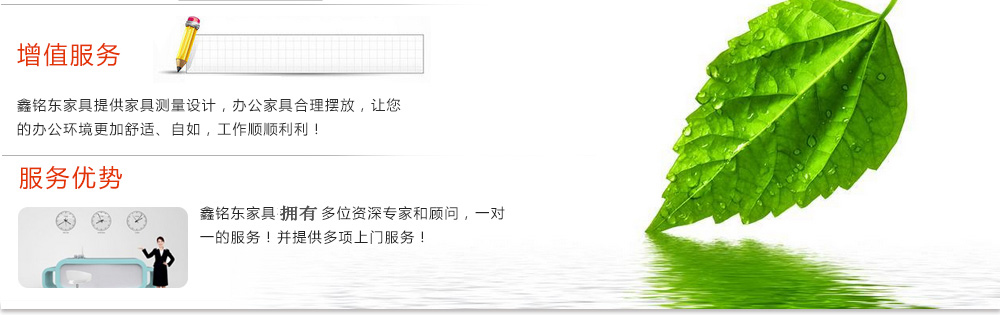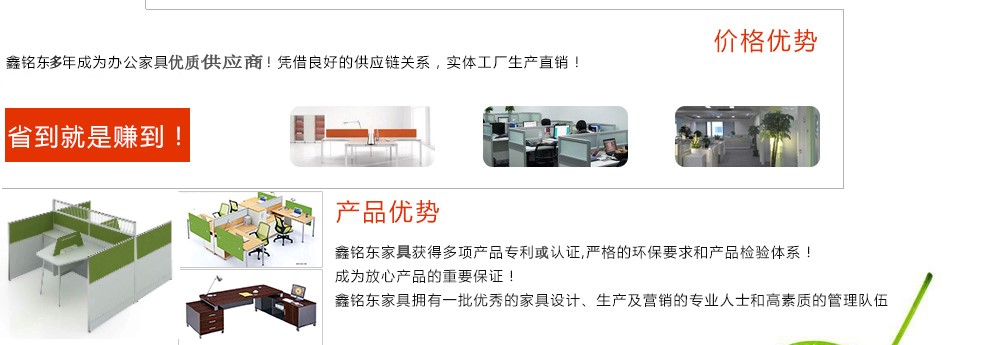 深圳市鑫銘東家具有限公司專業(yè)銷售各類辦公家具!產(chǎn)品涉及多種系列,如:班臺、班椅、屏風(fēng)、會議桌、會議椅、辦公沙發(fā)、茶幾、辦公桌、文件柜、電腦桌椅、各式餐臺、餐椅、書柜等辦公家具。 鑫銘東家具擁有一批優(yōu)秀的家具設(shè)計、生產(chǎn)及營銷的專業(yè)人士和高素質(zhì)的管理隊伍。銘東家具以"先難后易"之戰(zhàn)略,在產(chǎn)品結(jié)構(gòu)、產(chǎn)品質(zhì)量及服務(wù)水平方面,均推陳出新,力求完善,精益求精。使我們的產(chǎn)品質(zhì)量保持在國內(nèi)外家具潮流的先進水平,力求滿足客戶的特殊需求。鑫銘東家具多年來致力于環(huán)保、實用家具的設(shè)計與開發(fā),集生產(chǎn)、銷售、服務(wù)于一體。本著"以人為本"的設(shè)計理念,大量開發(fā)符合人體工程學(xué)的各種產(chǎn)品,以"誠信為本"的質(zhì)量方針,真材實料,認認真真做產(chǎn)品,實實在在做人。鑫銘東家具更致力于創(chuàng)造"零維修率"的制造境界,實現(xiàn)"沒有維修的服務(wù)才是最好服務(wù)"的口號》了解更多